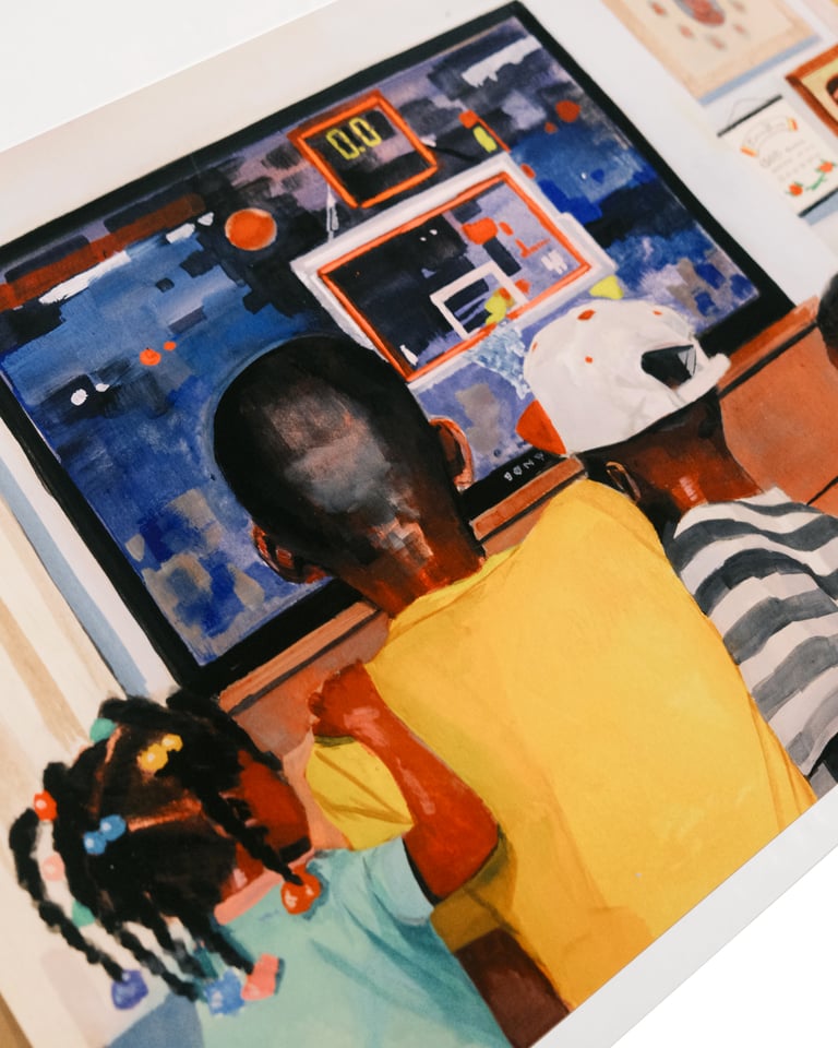 Beyond the game itself, the painting tells a deeper story. Motifs of Black heritage weave through the composition, while picture frames of family members line the walls, anchoring the subjects in their history and lineage providing a warm glimpse into the shared memories and unspoken bonds of the subjects depicted.