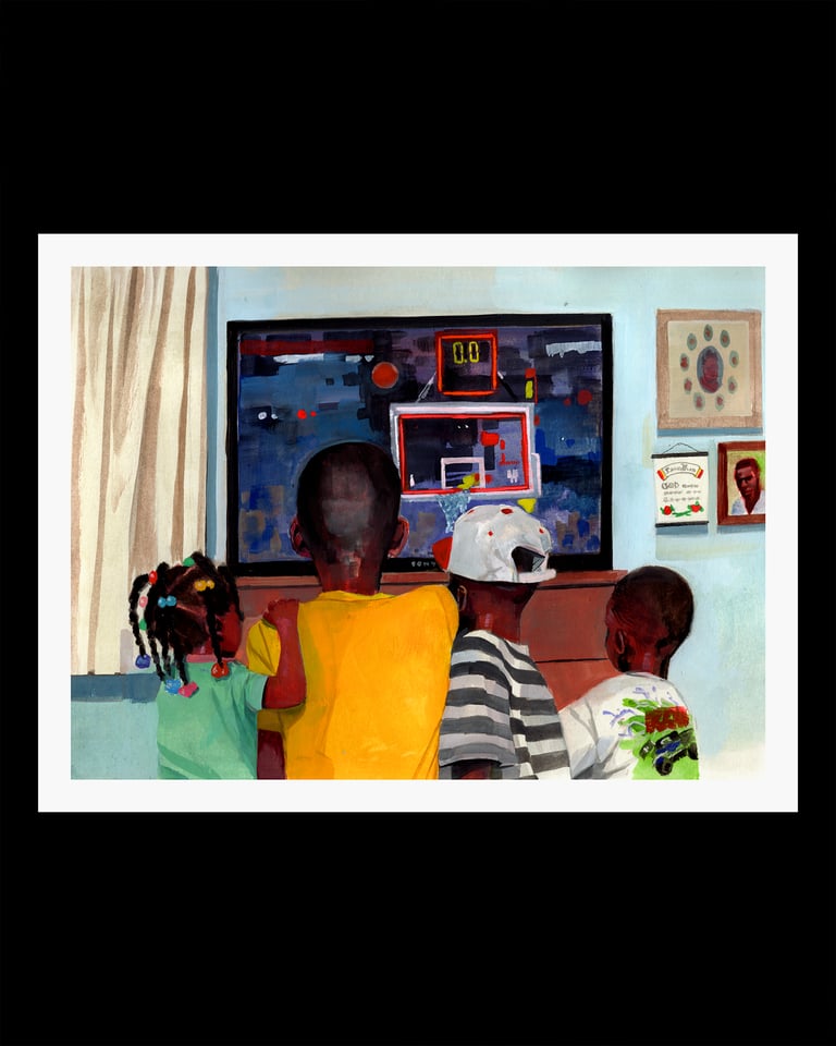'Through thick and thin' features a gathering of siblings overlooking the final seconds of a basketball game. Suspended in a frozen moment of time, the scene holds the weight of anticipation, just before either collective joy or heartbreak unfolds.